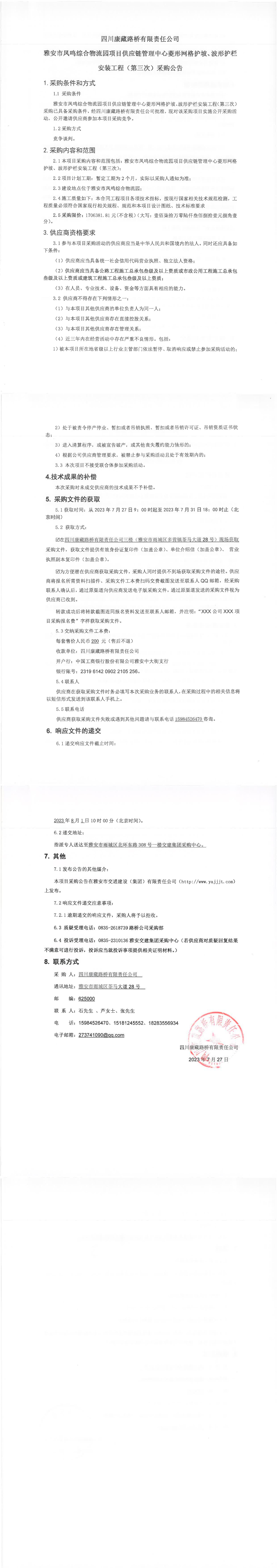 四川康藏路橋有限責(zé)任公司雅安市鳳鳴綜合物流園項(xiàng)目供應(yīng)鏈管理中心菱形網(wǎng)格護(hù)坡、波形護(hù)欄安裝工程(第三次)采購公告