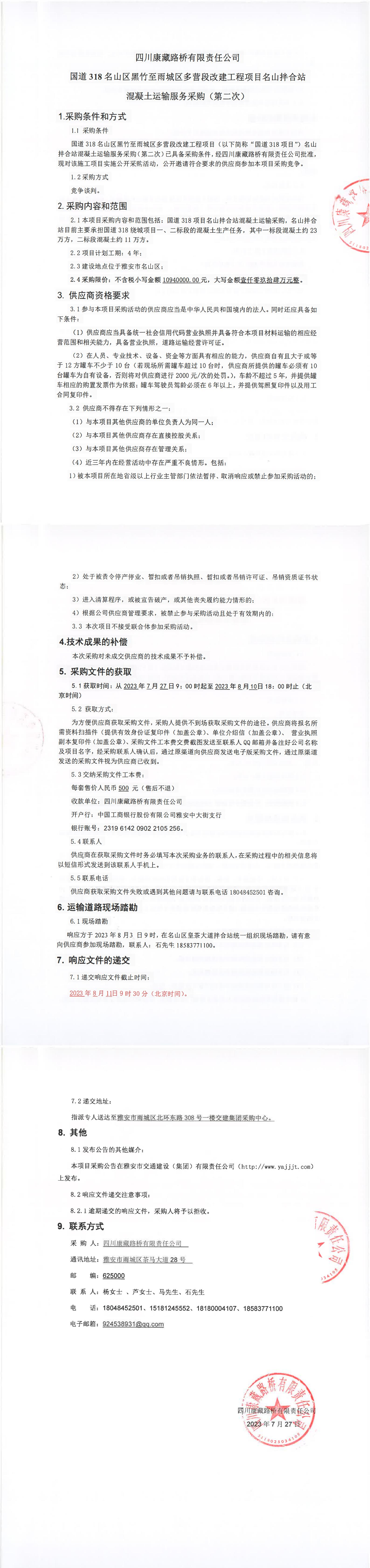 四川康藏路橋有限責(zé)任公司國道318名山區(qū)黑竹至雨城區(qū)多營段改建工程項目名山拌合站混凝土運(yùn)輸服務(wù)采購(第二次)