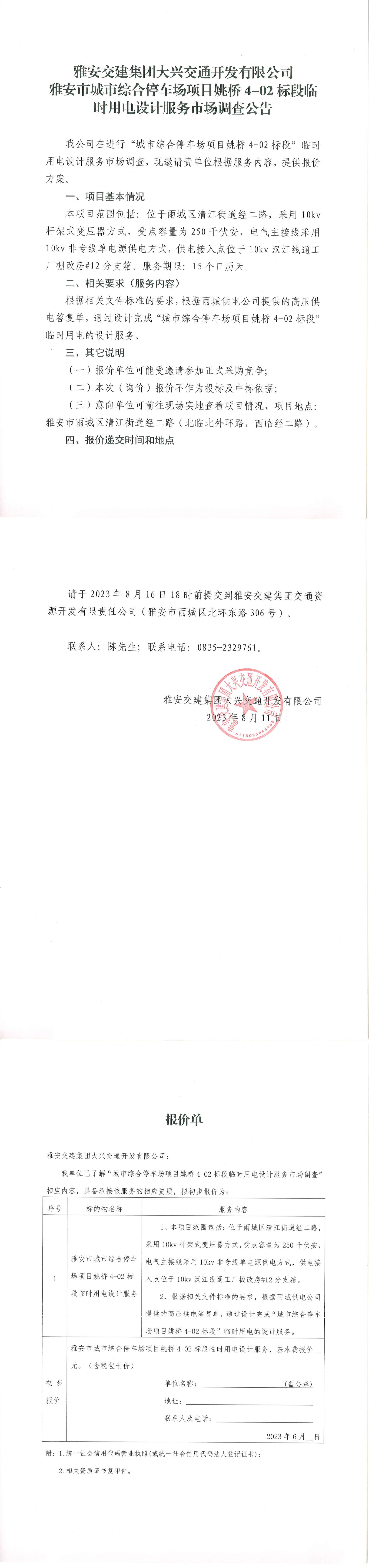 雅安交建集團(tuán)大興交通開發(fā)有限公司雅安市城市綜合停車場項目姚橋4-02標(biāo)段臨時用電設(shè)計服務(wù)市場調(diào)查公告