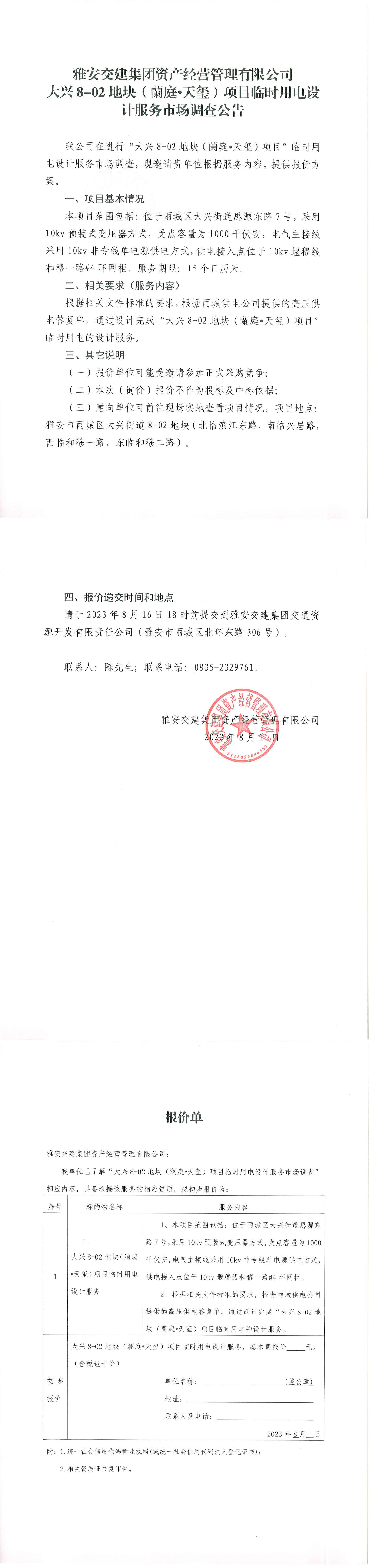 雅安交建集團(tuán)資產(chǎn)經(jīng)營管理有限公司大興8-02地塊(蘭庭·天璽)項(xiàng)目臨時(shí)用電設(shè)計(jì)服務(wù)市場調(diào)查公告