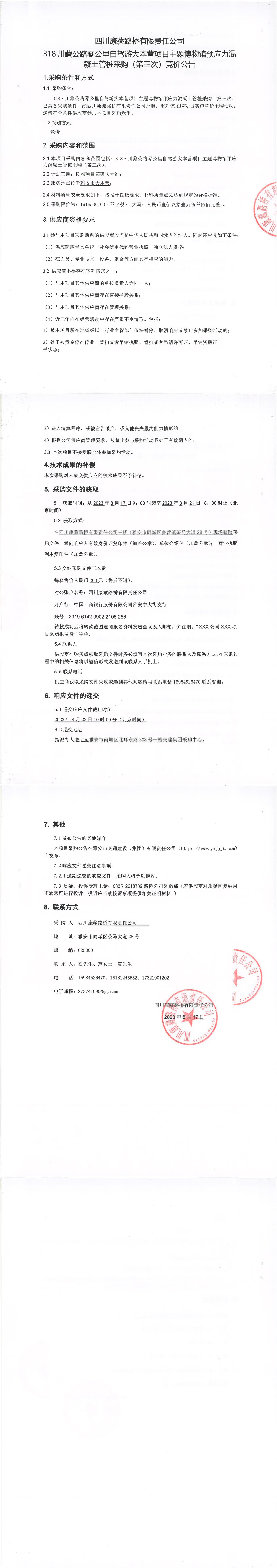 四川康藏路橋有限責(zé)任公司318·川藏公路零公里自駕游大本營項目主題博物館預(yù)應(yīng)力混凝土管樁采購(第三次)競價公告