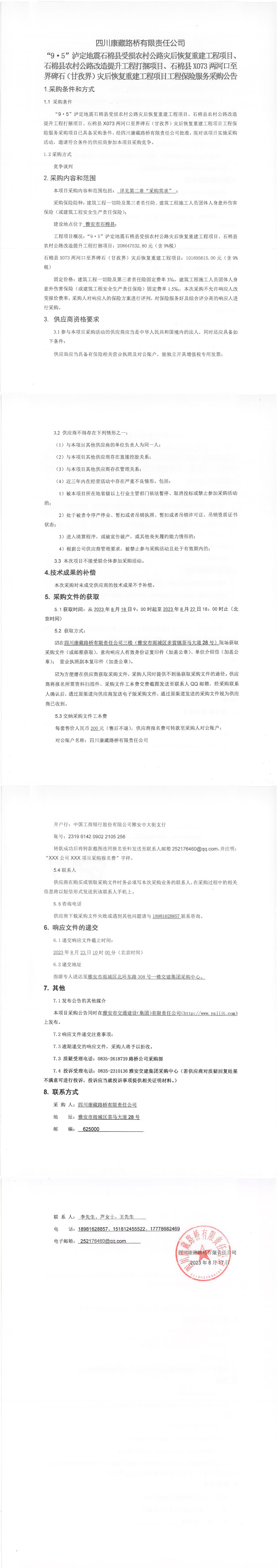 四川康藏路橋有限責(zé)任公司“9·5”瀘定地震石棉縣受損農(nóng)村公路災(zāi)后恢復(fù)重建工程項(xiàng)目、石棉縣農(nóng)村公路改造提升工程打捆項(xiàng)目、石棉縣X073兩河口至界碑石(甘孜界)災(zāi)后恢復(fù)重建工程項(xiàng)目工程保險(xiǎn)服務(wù)采購(gòu)公告