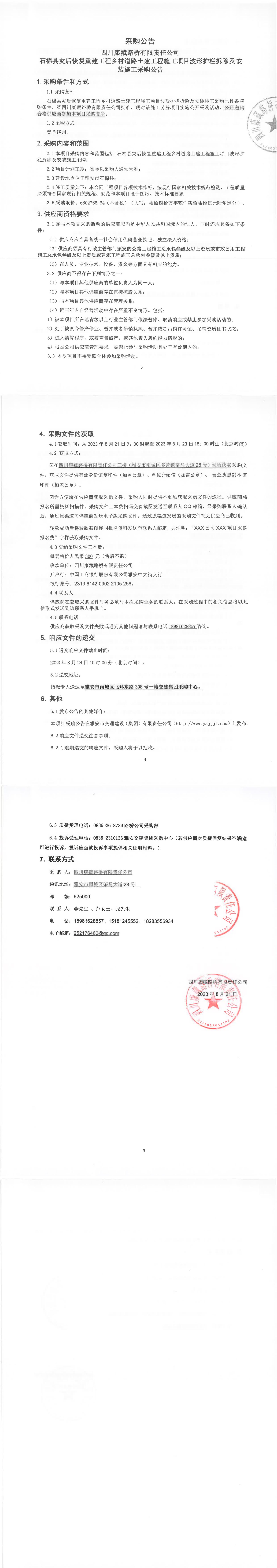 四川康藏路橋有限責(zé)任公司石棉縣災(zāi)后恢復(fù)重建工程鄉(xiāng)村道路土建工程施工項目波形護欄拆除及安裝施工采購公告