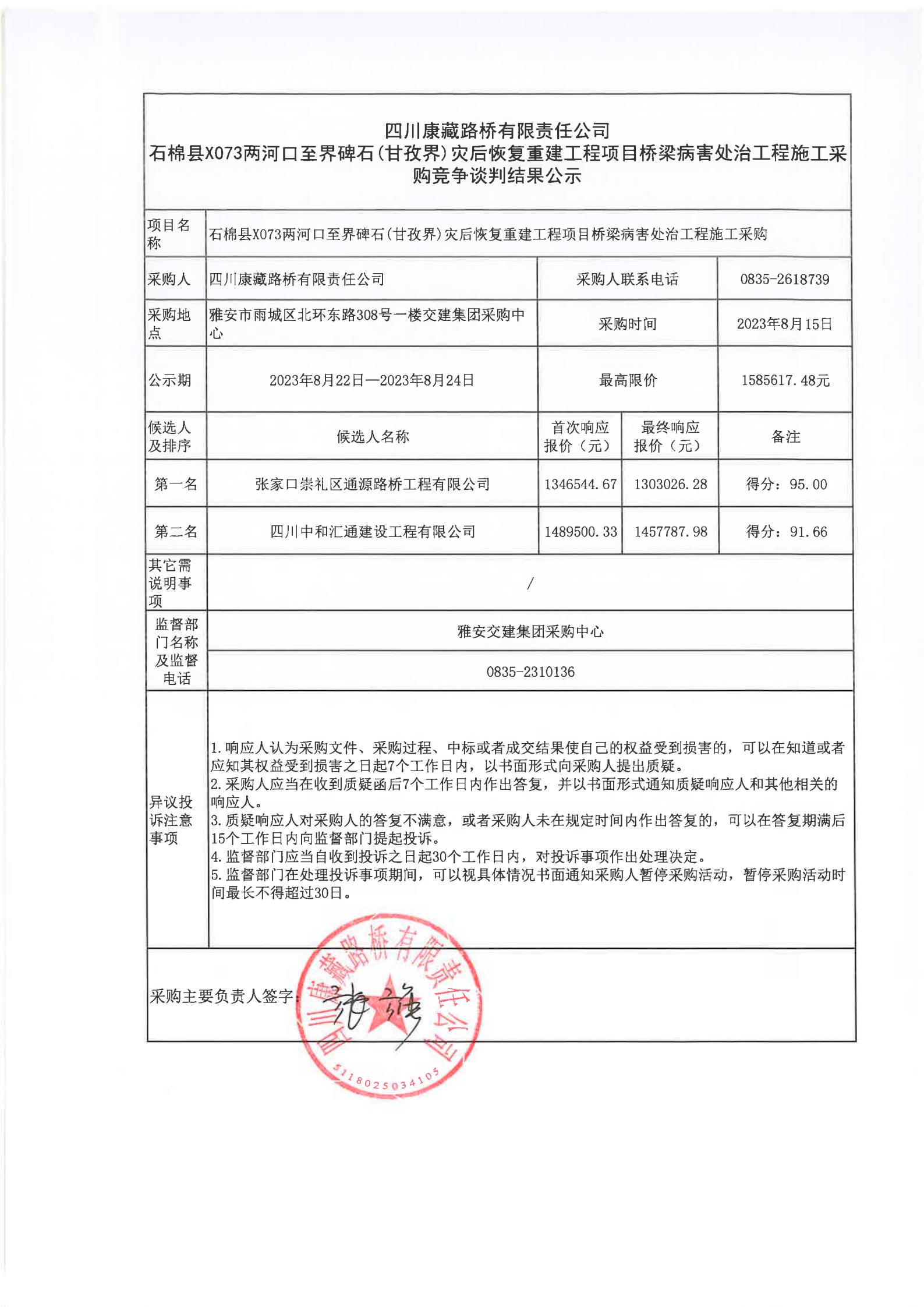 四川康藏路橋有限責(zé)任公司石棉縣X073兩河口至界碑石(甘孜界)災(zāi)后恢復(fù)重建工程項(xiàng)目橋梁病害處治工程施工采購競爭談判結(jié)果公示