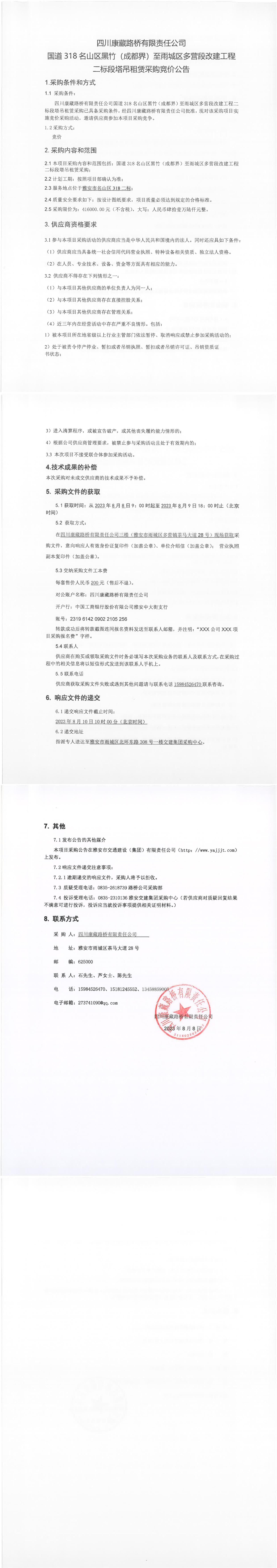 四川康藏路橋有限責任公司國道318名山區(qū)黑竹(成都界)至雨城區(qū)多營段改建工程二標段塔吊租賃采購競價公告