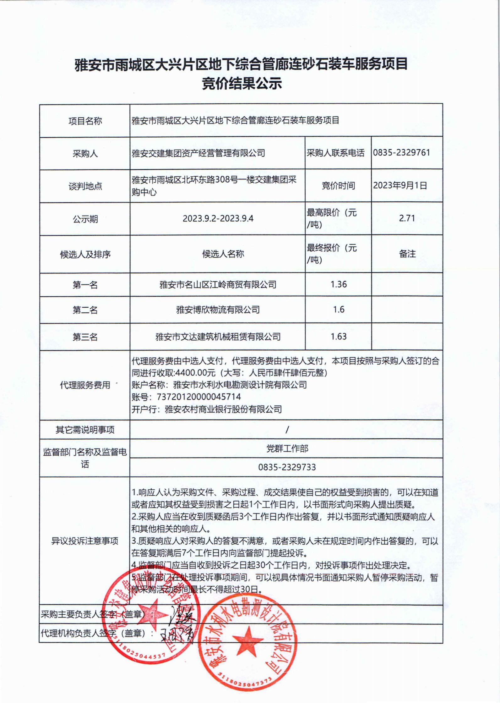 雅安交建集團資產(chǎn)經(jīng)營管理有限公司大興片區(qū)地下綜合管廊連砂石裝車服務項目競價結(jié)果公示