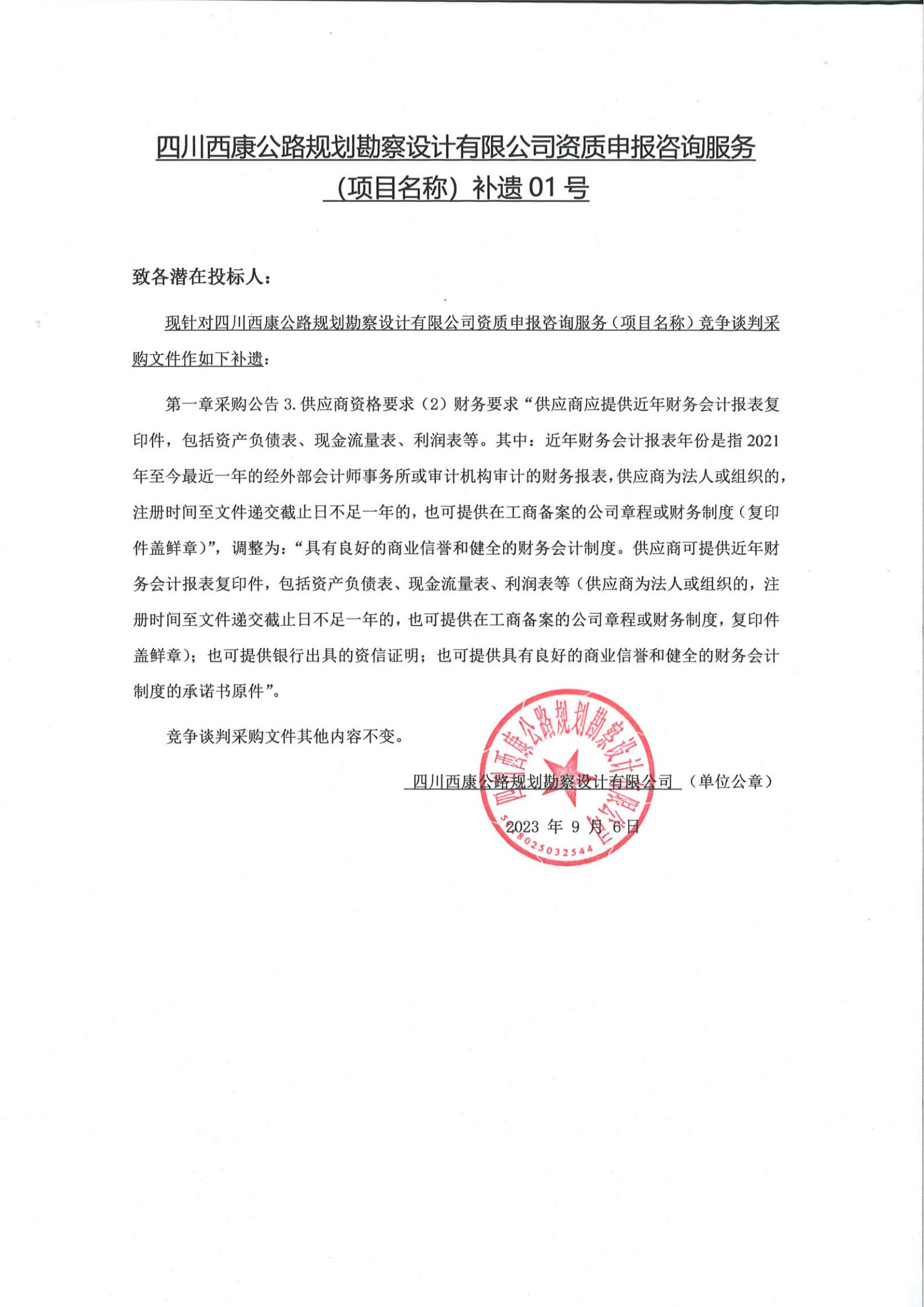 四川西康公路規(guī)劃勘察設(shè)計(jì)有限公司資質(zhì)申報(bào)咨詢服務(wù)(項(xiàng)目名稱)補(bǔ)遺01號(hào)