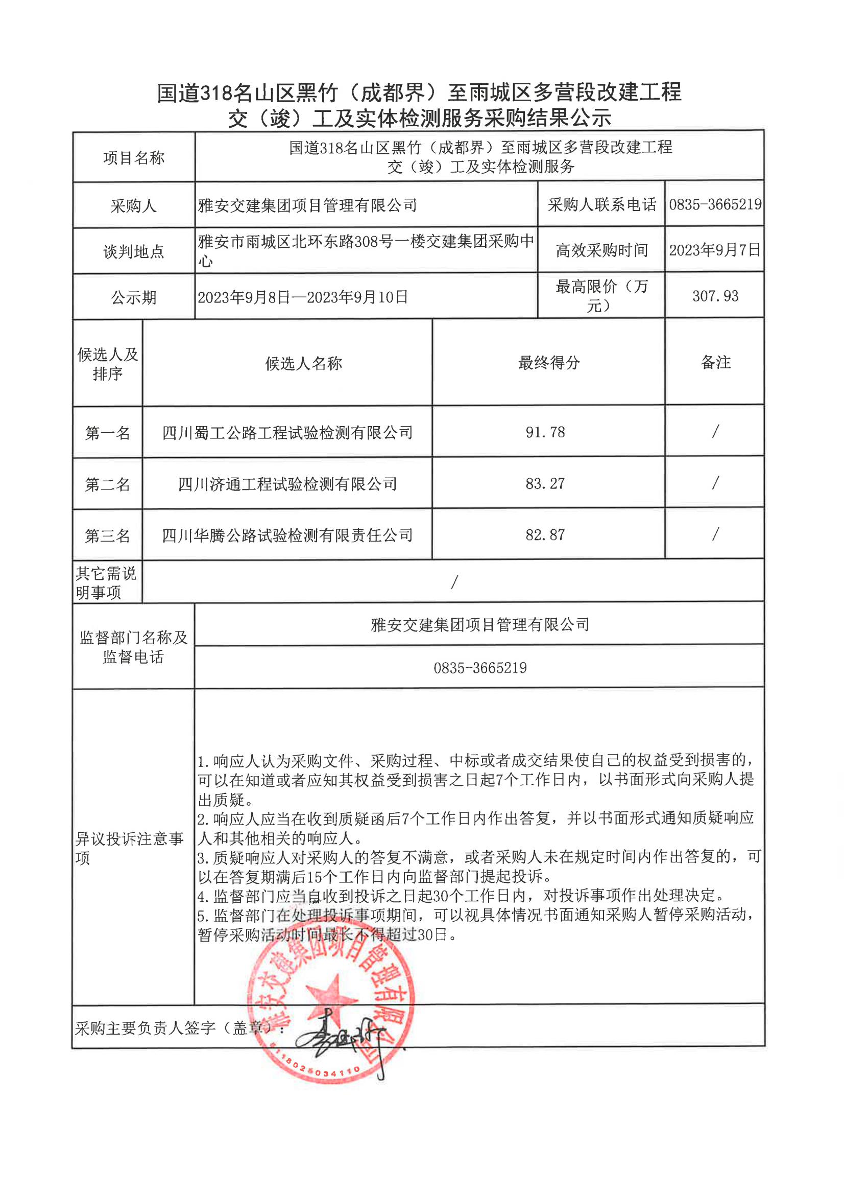 雅安交建集團項目管理有限公司國道318名山區(qū)黑竹(成都界)至雨城區(qū)多營段改建工程交(竣)工及實體檢測服務(wù)采購結(jié)果公示