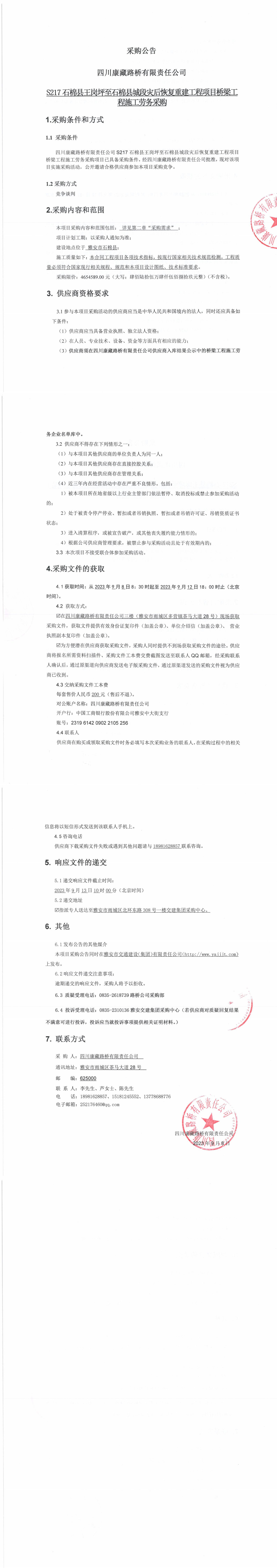 四川康藏路橋有限責任公司S217石棉縣王崗坪至石棉縣城段災后恢復重建工程項目橋梁工程施工勞務(wù)采購公告