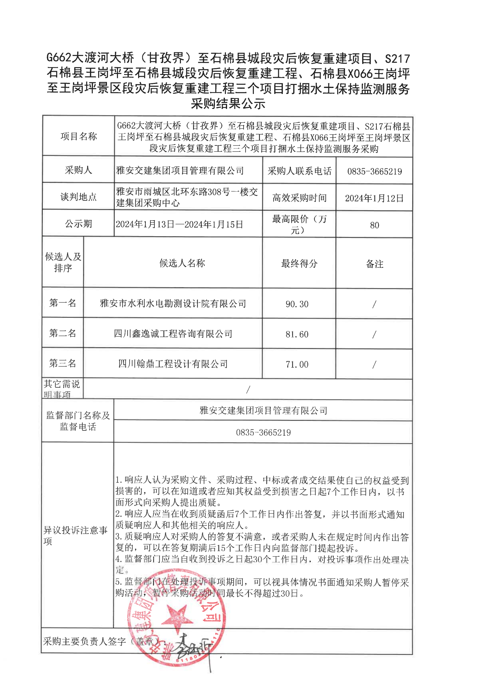 雅安交建集團(tuán)項(xiàng)目管理有限公司G662大渡河大橋(甘孜界)至石棉縣城段災(zāi)后恢復(fù)重建項(xiàng)目、S217石棉縣王崗坪至石棉縣城段災(zāi)后恢復(fù)重建工程、石棉縣X066王崗坪至王崗坪景區(qū)段災(zāi)后恢復(fù)重建工程三個(gè)項(xiàng)目打捆水土保持監(jiān)測服務(wù)采購結(jié)果公示