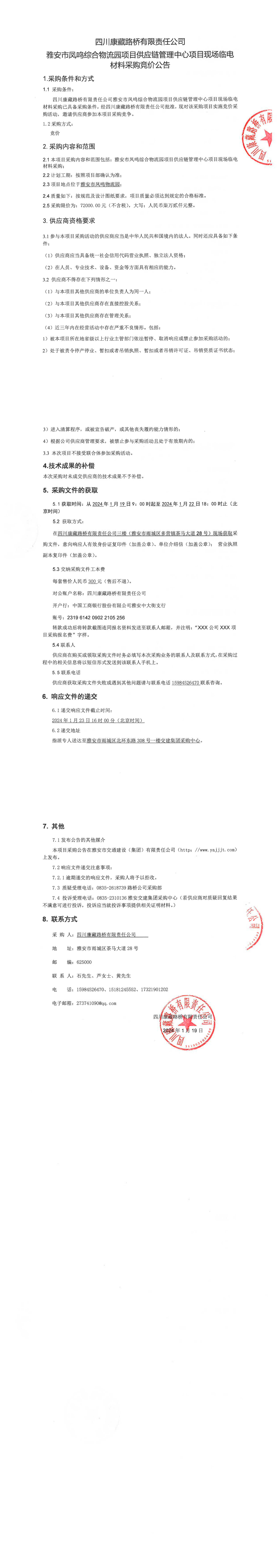 四川康藏路橋有限責任公司雅安市鳳鳴綜合物流園項目供應(yīng)鏈管理中心項目現(xiàn)場臨電材料采購競價公告