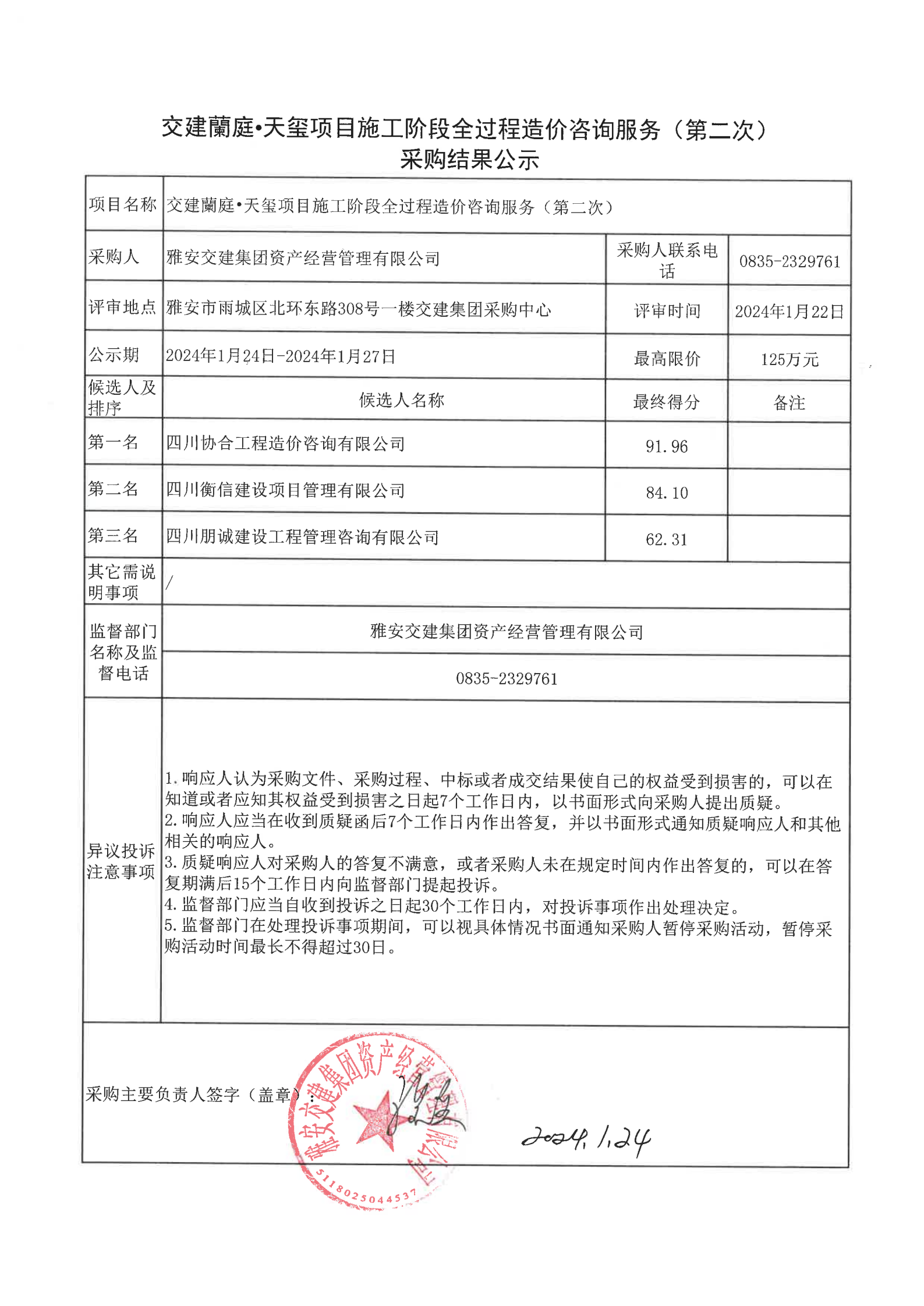 雅安交建集團(tuán)資產(chǎn)經(jīng)營管理有限公司交建蘭庭·天璽項(xiàng)目施工階段全過程造價(jià)咨詢服務(wù)(第二次)采購結(jié)果公示
