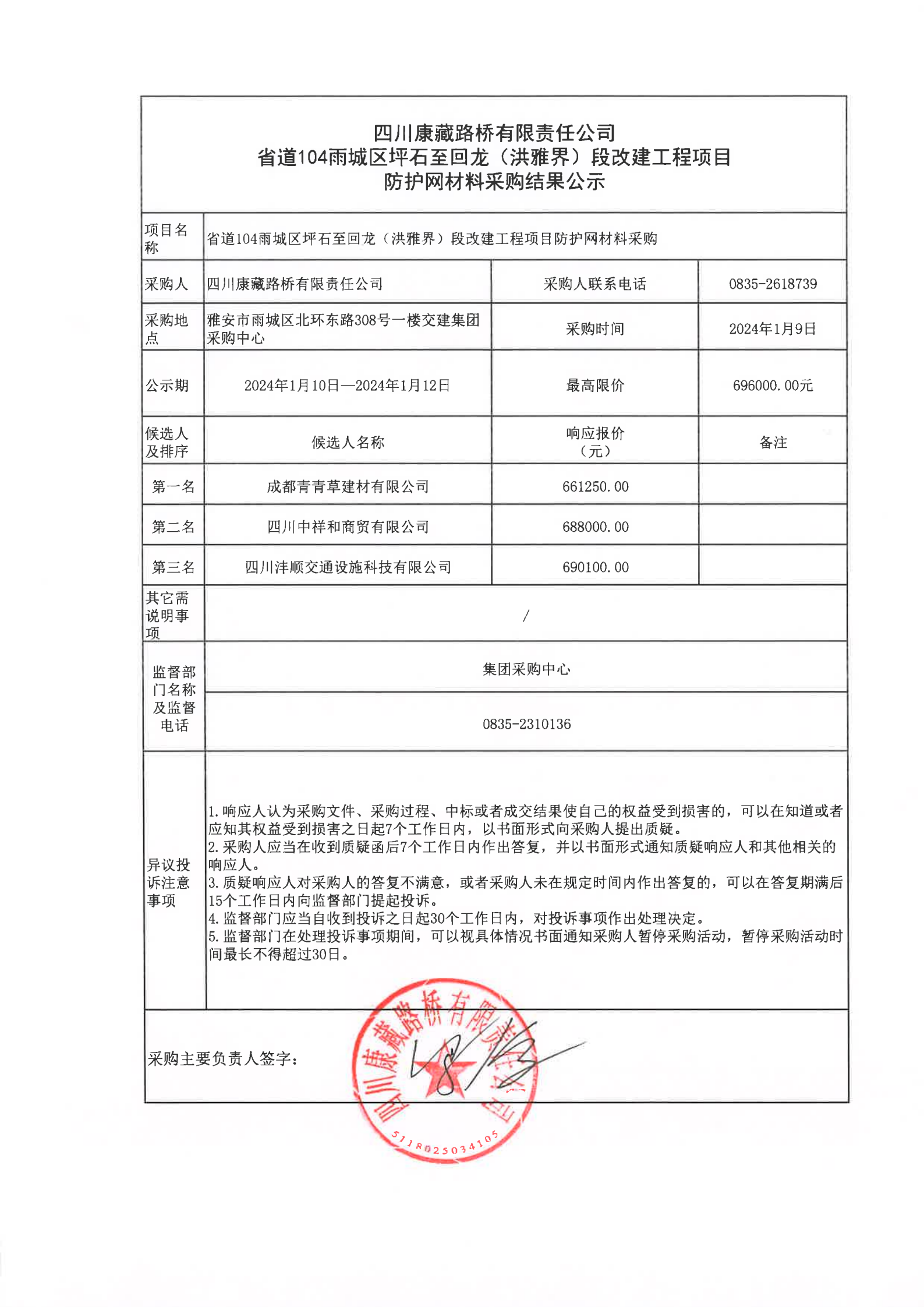 四川康藏路橋有限責(zé)任公司省道104雨城區(qū)坪石至回龍(洪雅界)段改建工程項(xiàng)目防護(hù)網(wǎng)材料采購(gòu)結(jié)果公示