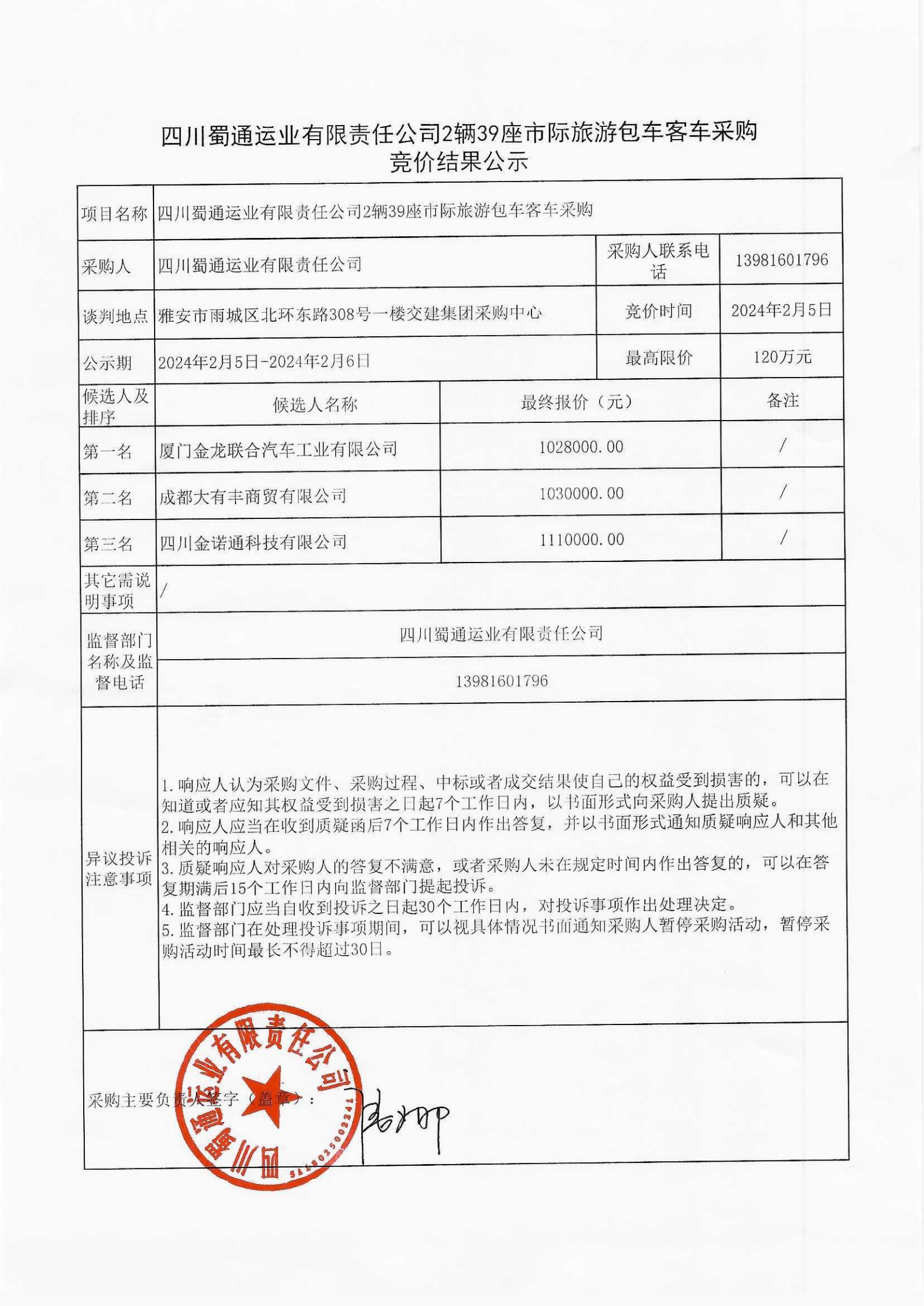 四川蜀通運業(yè)有限責任公司2輛39座市際旅游包車客車采購競價結(jié)果公示