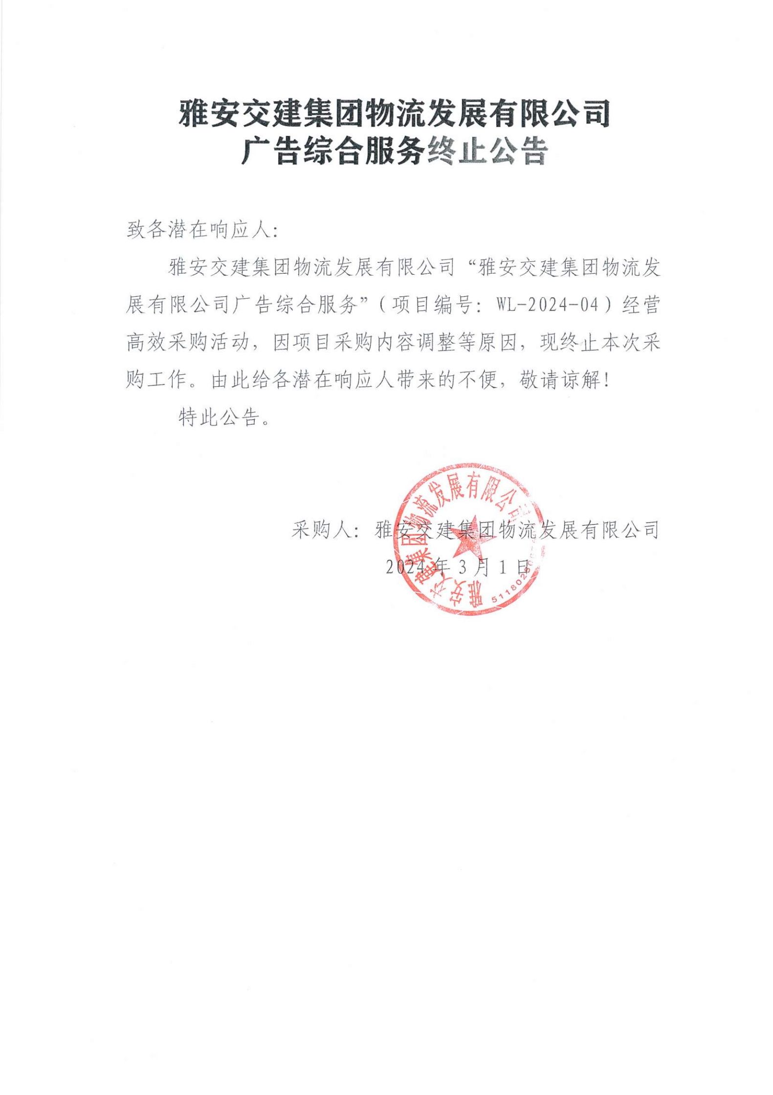 雅安交建集團物流發(fā)展有限公司廣告綜合服務(wù)終止公告