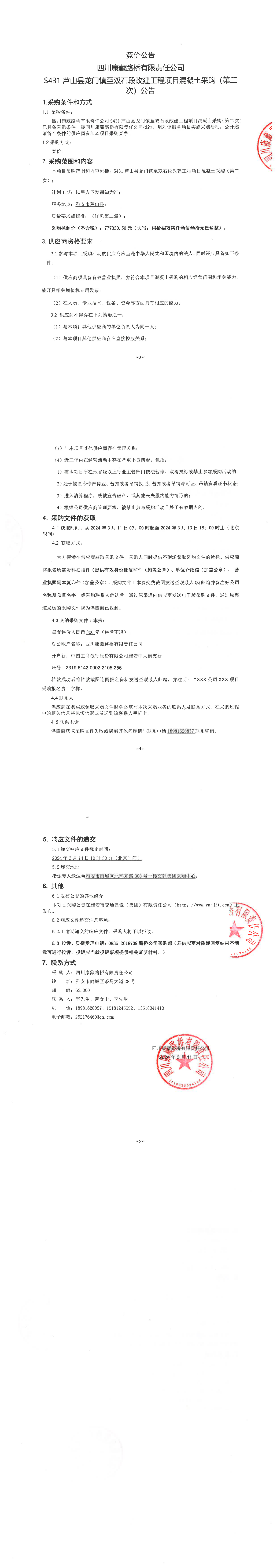 四川康藏路橋有限責任公司S431蘆山縣龍門鎮(zhèn)至雙石段改建工程項目混凝土采購(第二次)公告