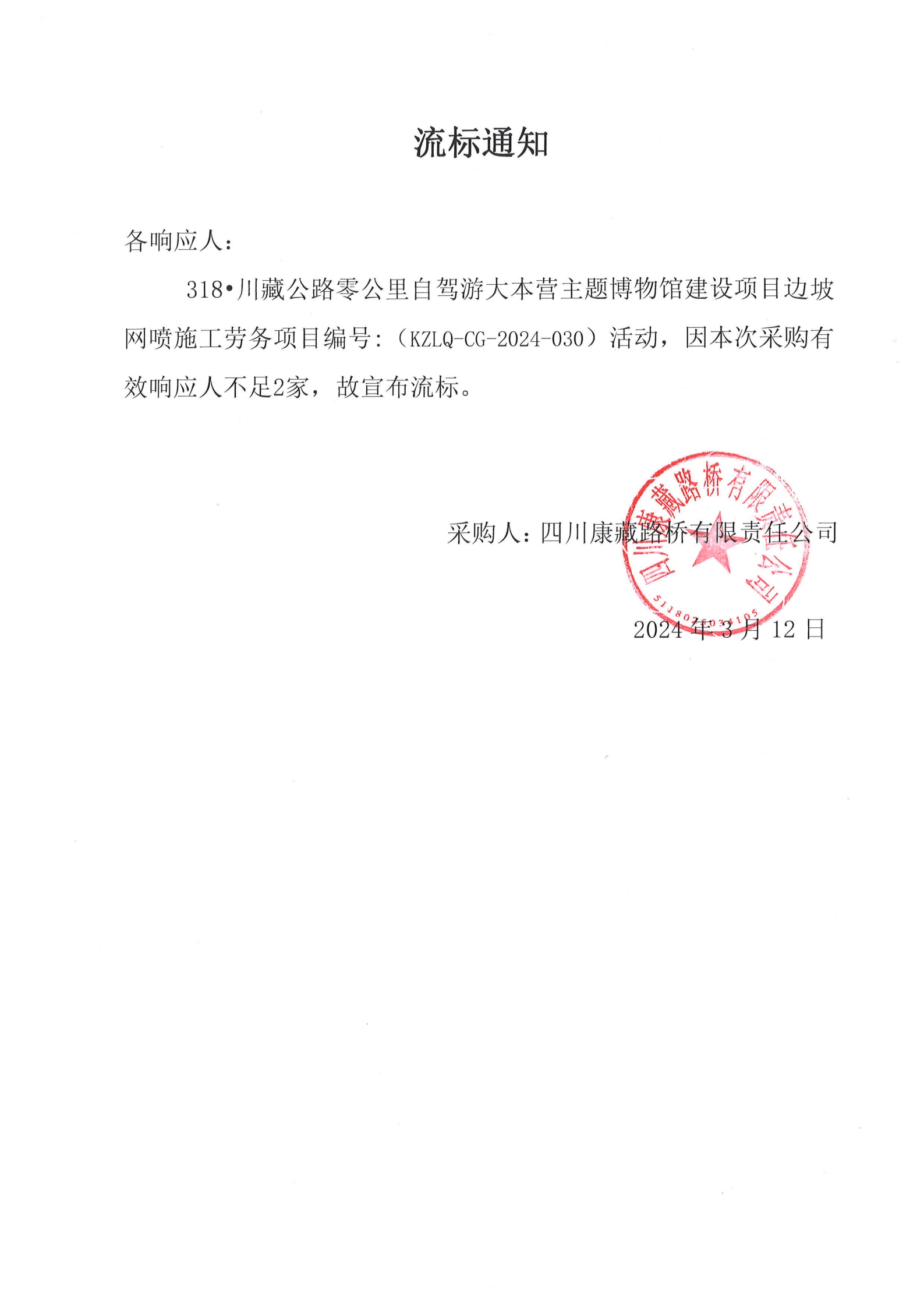 四川康藏路橋有限責任公司318·川藏公路零公里自駕游大本營主題博物館建設項目邊坡網(wǎng)噴施工勞務流標通知