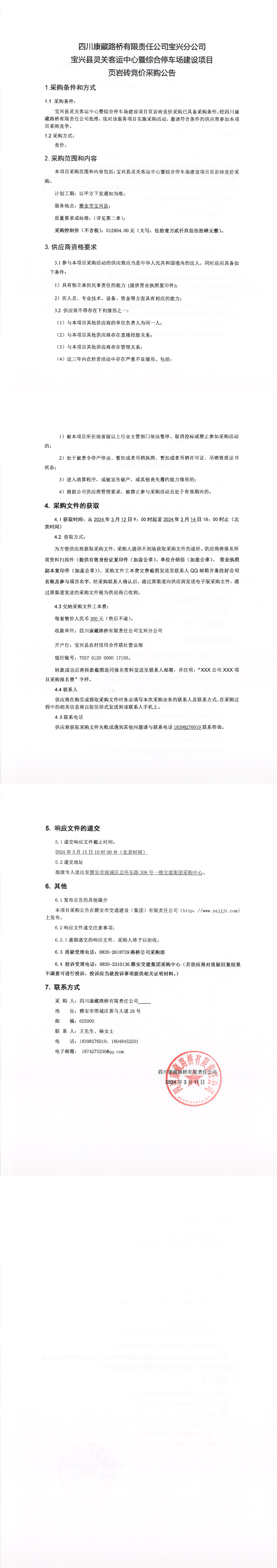 四川康藏路橋有限責任公司寶興縣靈關(guān)客運中心暨綜合停車場建設項目頁巖磚競價采購公告