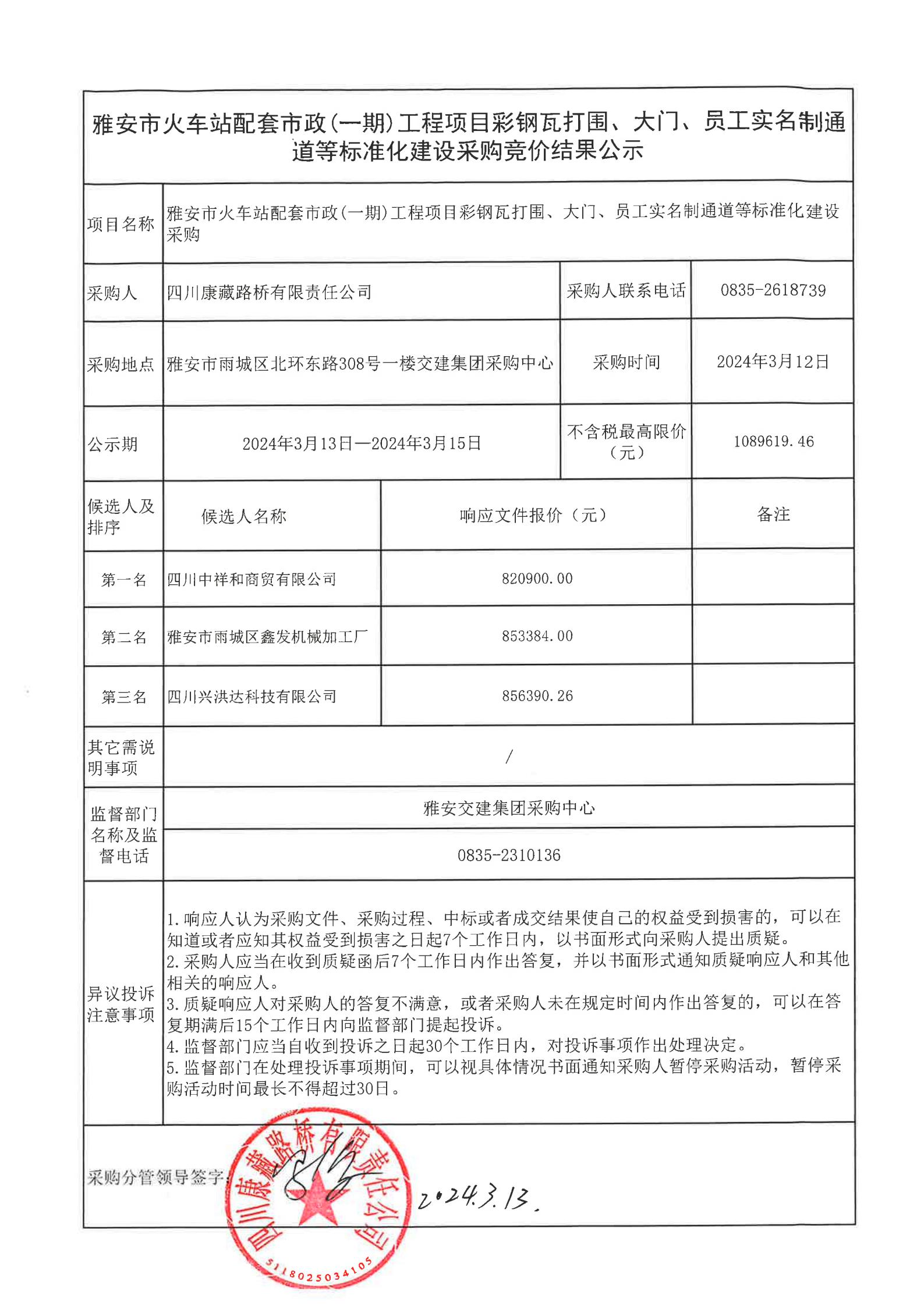 四川康藏路橋有限責(zé)任公司雅安市火車(chē)站配套市政(一期)工程項(xiàng)目彩鋼瓦打圍、大門(mén)、員工實(shí)名制通道等標(biāo)準(zhǔn)化建設(shè)采購(gòu)結(jié)果公示