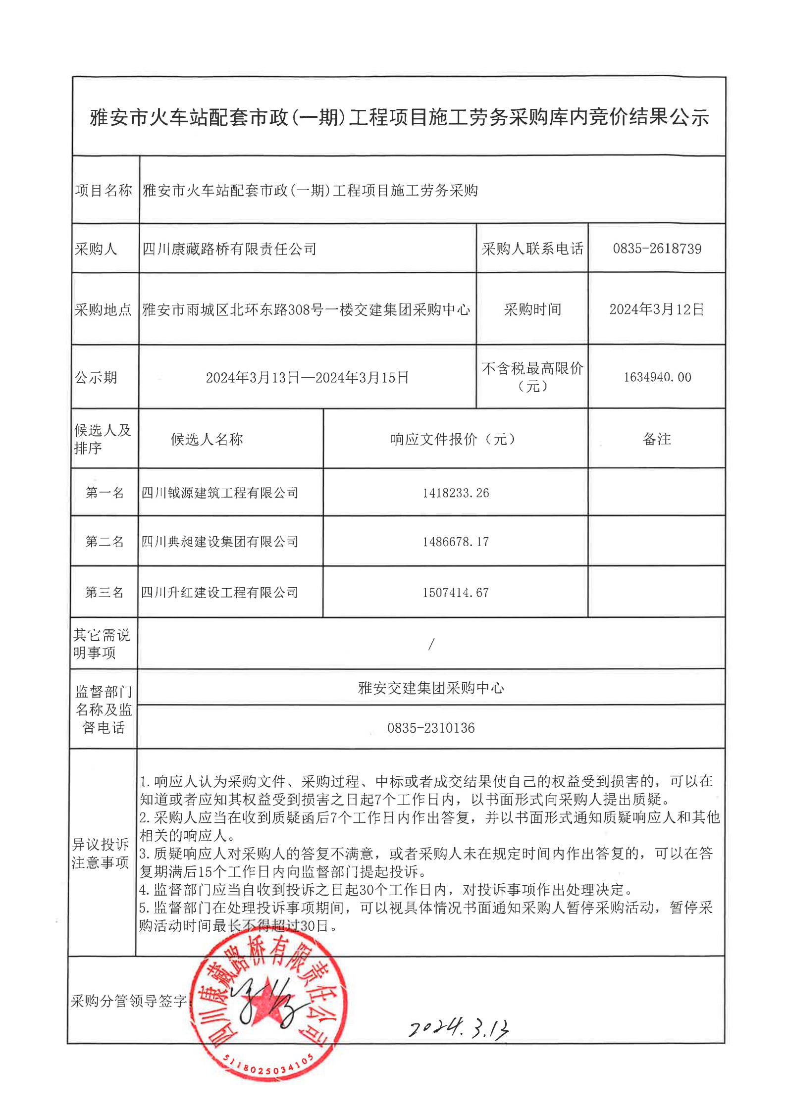 四川康藏路橋有限責任公司雅安市火車站配套市政(一期)工程項目施工勞務采購結(jié)果公示