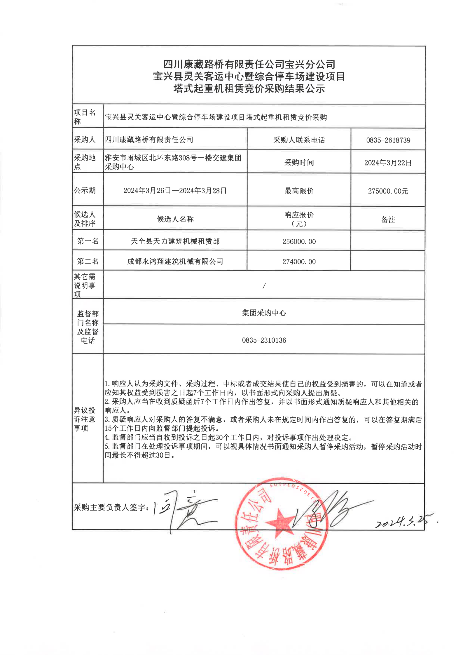 四川康藏路橋有限責(zé)任公司寶興縣靈關(guān)客運(yùn)中心暨綜合停車(chē)場(chǎng)建設(shè)項(xiàng)目塔式起重機(jī)租賃競(jìng)價(jià)采購(gòu)結(jié)果公示