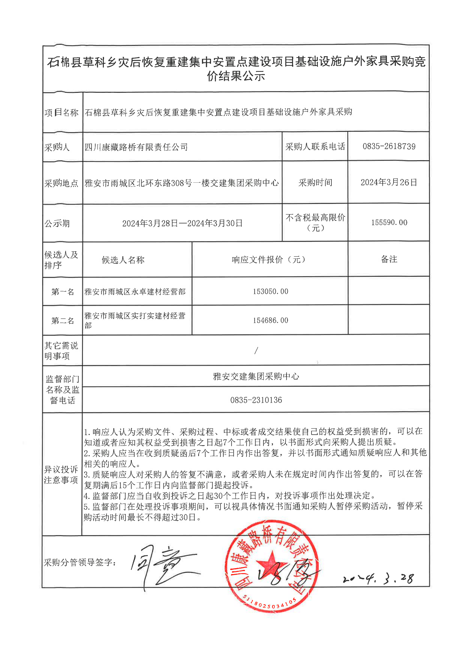 四川康藏路橋有限責(zé)任公司石棉縣草科鄉(xiāng)災(zāi)后恢復(fù)重建集中安置點(diǎn)建設(shè)項(xiàng)目基礎(chǔ)設(shè)施戶(hù)外家具采購(gòu)競(jìng)價(jià)結(jié)果公示