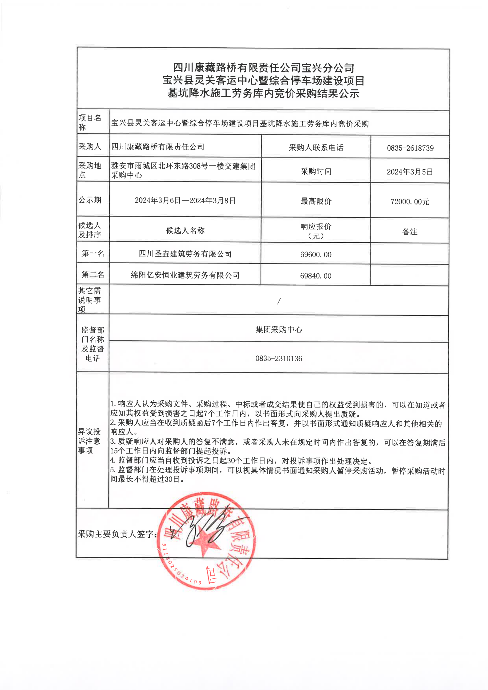 四川康藏路橋有限責(zé)任公司寶興分公司寶興縣靈關(guān)客運(yùn)站中心暨綜合停車場建設(shè)項目基坑降水施工勞務(wù)庫內(nèi)競價采購結(jié)果公示