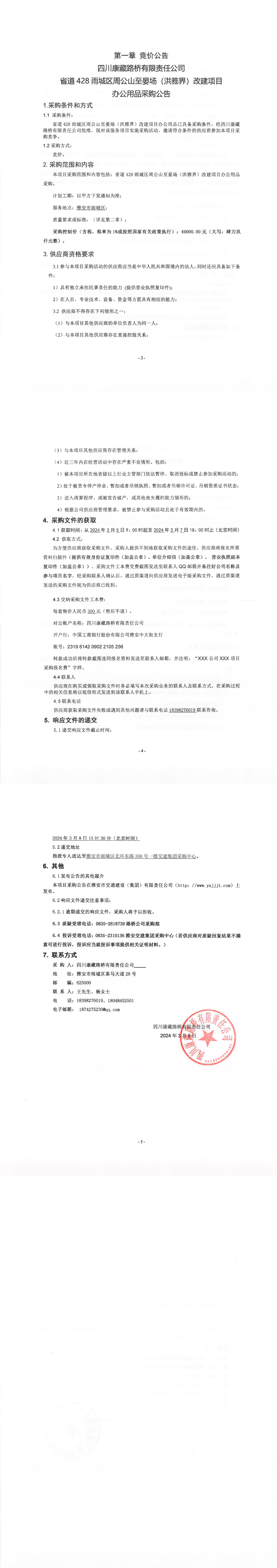 四川康藏路橋有限責(zé)任公司省道428雨城區(qū)周公山至晏場(洪雅界)改建項目辦公用品采購公告