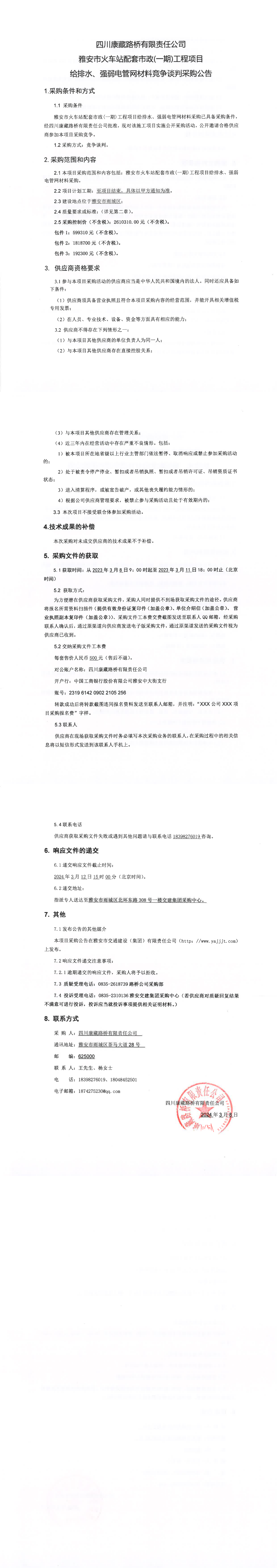 四川康藏路橋有限責任公司雅安市火車站配套市政(一期)工程項目給排水、強弱電管網(wǎng)材料競爭談判采購公告