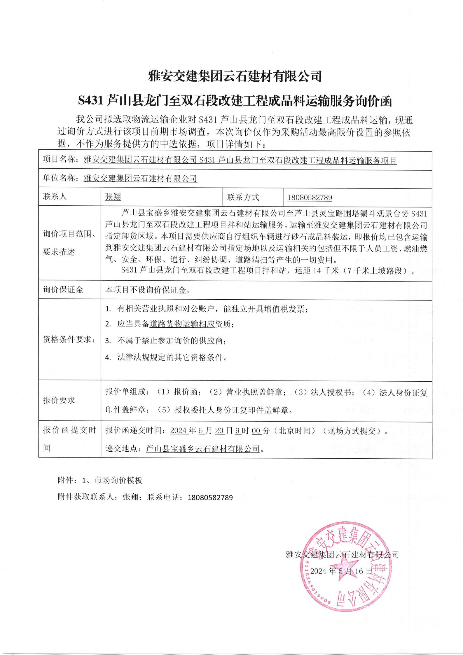 雅安交建集團(tuán)云石建材有限公司S431蘆山縣龍門(mén)至雙石段改建工程成品料運(yùn)輸服務(wù)項(xiàng)目詢價(jià)函