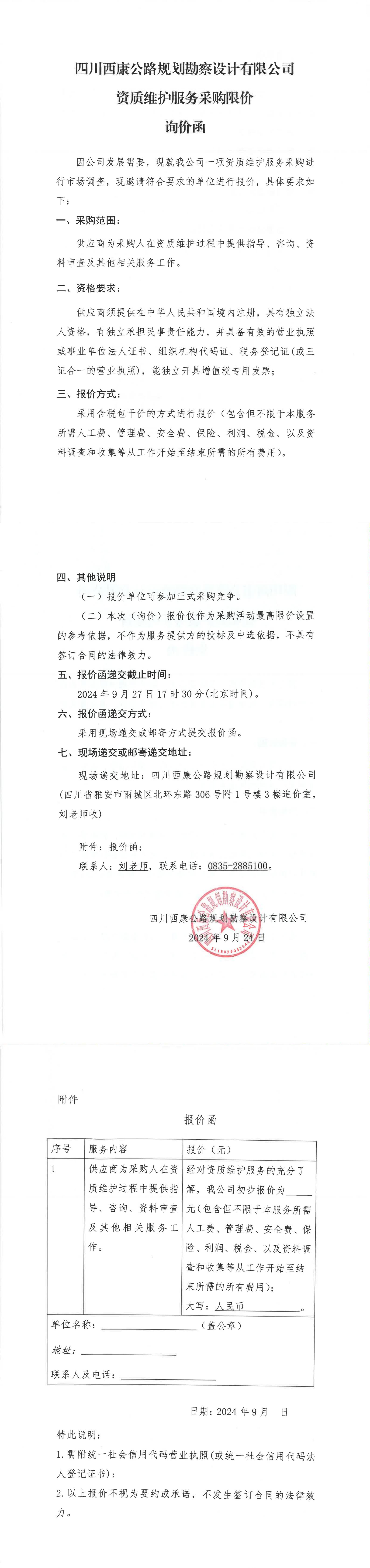 四川西康公路規(guī)劃勘察設(shè)計(jì)有限公司資質(zhì)維護(hù)服務(wù)采購(gòu)限價(jià)詢價(jià)函