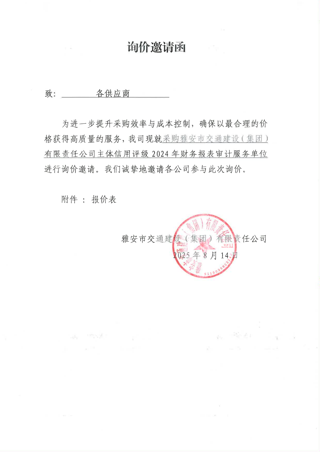關(guān)于采購雅安市交通建設(shè)(集團)有限責(zé)任公司主體信用評級2024年財務(wù)報表審計服務(wù)單位的詢價函