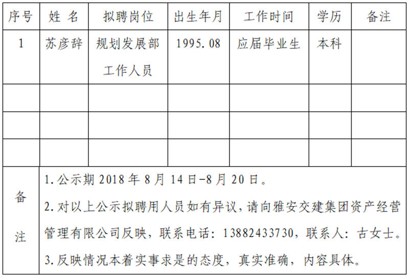 通過(guò)公開(kāi)報(bào)名、資格審查、筆試、面試等程序,經(jīng)雅安交建集團(tuán)資產(chǎn)經(jīng)營(yíng)管理有限公司研究擇優(yōu)確定以下1名擬聘用人員,現(xiàn)公示名單如下:
