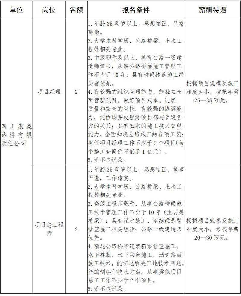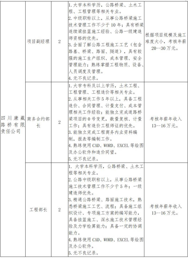 根據(jù)發(fā)展需要,決定面向社會公開招聘雅安市交通建設(shè)(集團(tuán))有限責(zé)任公司(以下簡稱“雅安交建集團(tuán)”)所屬子公司工程項(xiàng)目主要負(fù)責(zé)人10名,現(xiàn)將有關(guān)事項(xiàng)公告如下: