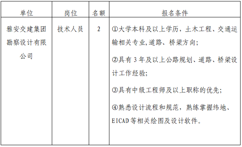 根據(jù)發(fā)展需要,決定面向社會(huì)公開(kāi)招聘雅安市交通建設(shè)(集團(tuán))有限責(zé)任公司(以下簡(jiǎn)稱(chēng)“雅安交建集團(tuán)”)所屬子公司工作人員2名,現(xiàn)將有關(guān)事項(xiàng)公告如下: