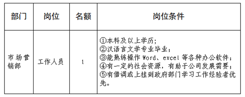 根據(jù)發(fā)展需要,決定面向社會(huì)公開(kāi)招聘雅安市交通建設(shè)(集團(tuán))有限責(zé)任公司(以下簡(jiǎn)稱“雅安交建集團(tuán)”)所屬子公司工作人員1名,現(xiàn)將有關(guān)事項(xiàng)公告如下: