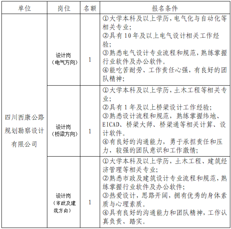 根據(jù)發(fā)展需要,決定面向社會(huì)公開(kāi)招聘雅安市交通建設(shè)(集團(tuán))有限責(zé)任公司(以下簡(jiǎn)稱“雅安交建集團(tuán)”)所屬子公司專業(yè)技術(shù)人才3名,現(xiàn)將有關(guān)事項(xiàng)公告如下: