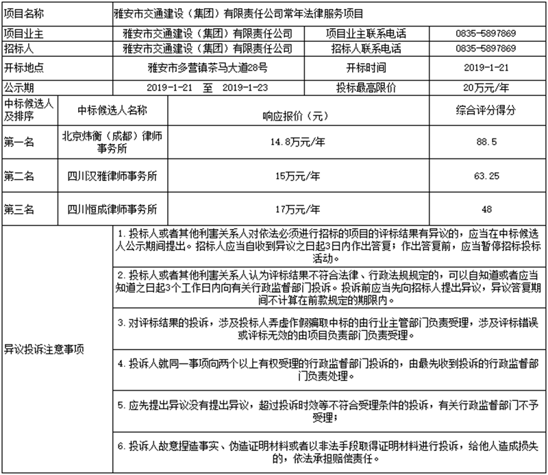 雅安市交通建設(集團)有限責任公司常年法律服務項目公示