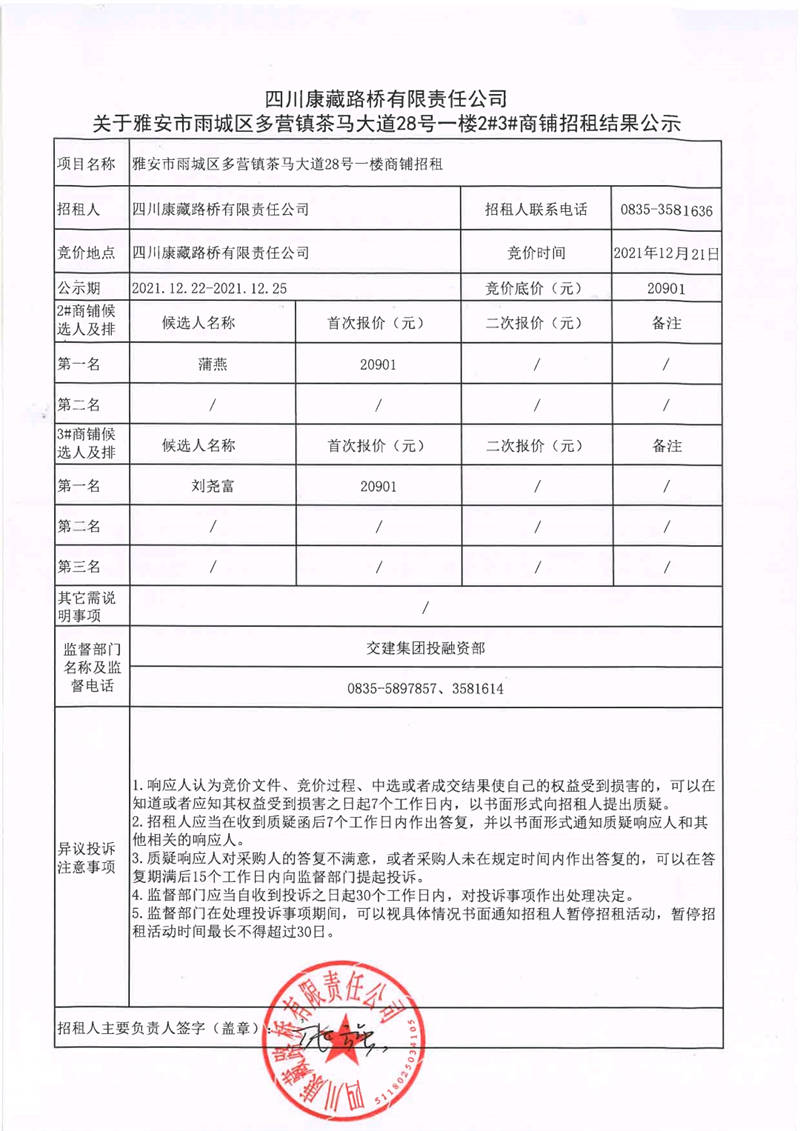 關(guān)于雅安市雨城區(qū)多營(yíng)鎮(zhèn)茶馬大道28號(hào)一樓2#3#商鋪招租結(jié)果公示