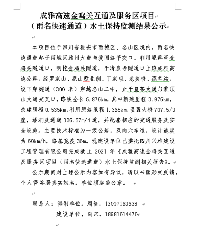 成雅高速金雞關(guān)互通及服務(wù)區(qū)項目(雨名快速通道)水土保持監(jiān)測結(jié)果公示