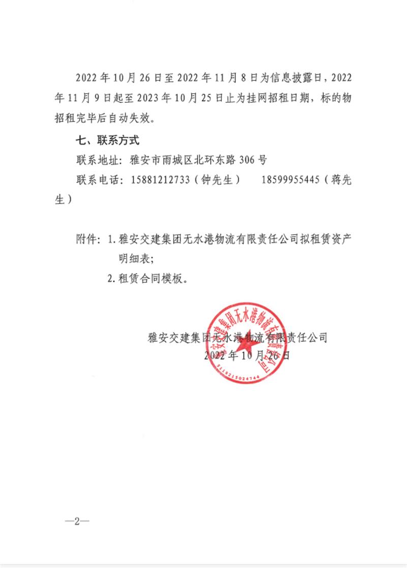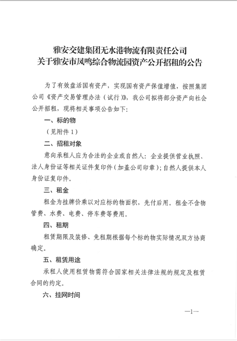 雅安交建集團(tuán)無水港物流有限責(zé)任公司關(guān)于雅安市鳳鳴綜合物流園資產(chǎn)公開招租的公告