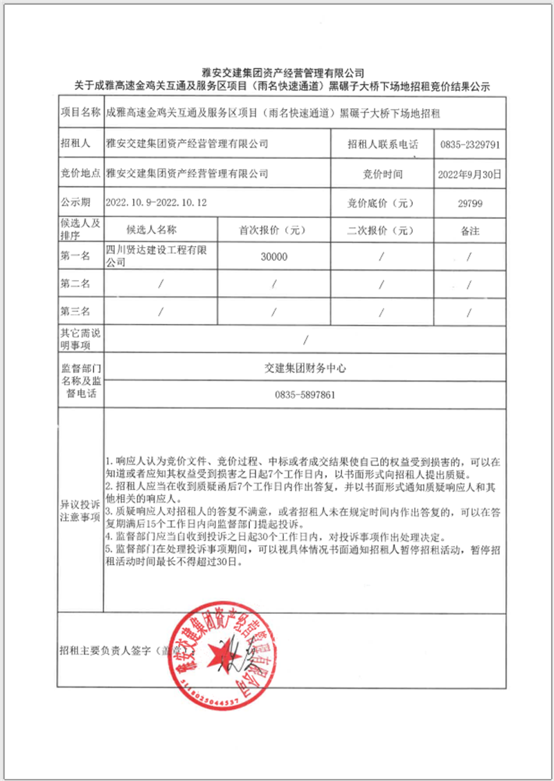 關(guān)于成雅高速金雞關(guān)互通及服務(wù)區(qū)項(xiàng)目(雨名快速通道)黑碾子大橋下場(chǎng)地招租競(jìng)價(jià)結(jié)果公示