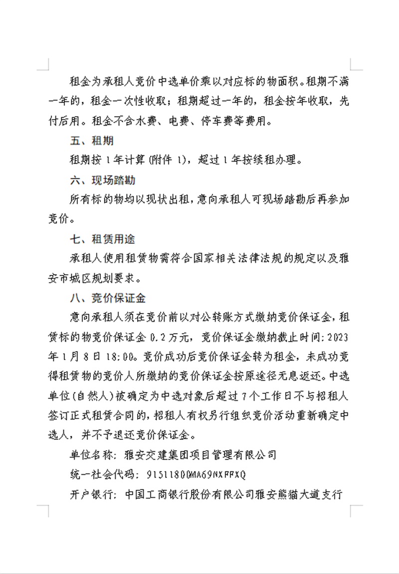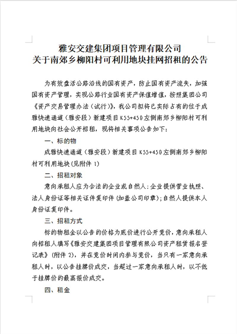 雅安交建集團(tuán)項(xiàng)目管理有限公司 關(guān)于南郊鄉(xiāng)柳陽(yáng)村可利用地塊公開招租的公告資料