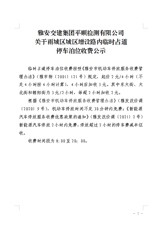雅安交建集團(tuán)平順檢測(cè)有限公司關(guān)于雨城區(qū)城區(qū)增設(shè)路內(nèi)臨時(shí)占道停車(chē)泊位收費(fèi)公示