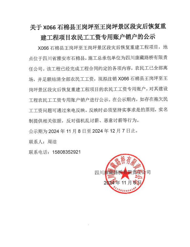 關(guān)于X066石棉縣王崗坪至王崗坪景區(qū)段災(zāi)后恢復(fù)重建工程項目農(nóng)民工工資專用賬戶銷戶的公示