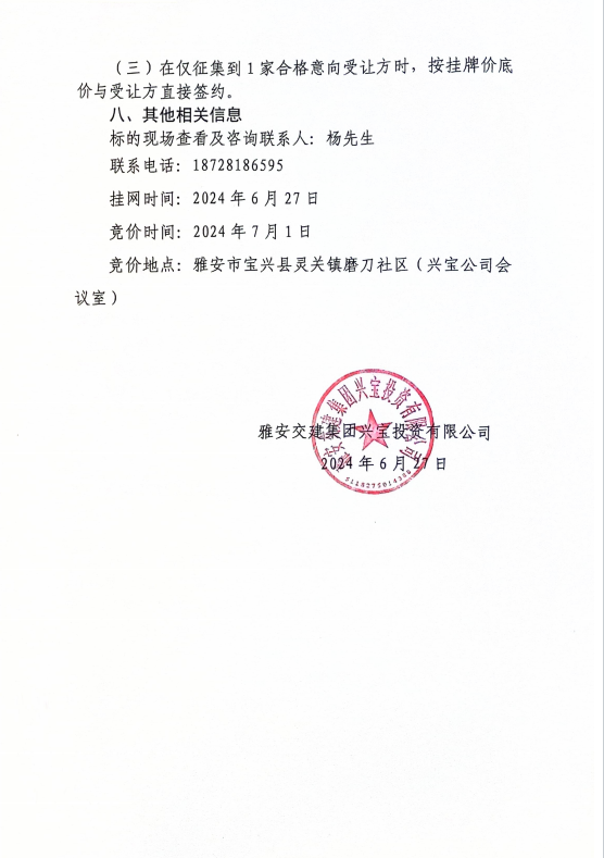 雅安交建集團興寶投資有限公司寶興縣靈關(guān)鎮(zhèn)代碑寺土地整理項目10萬噸可利用棄渣競價銷售公告(2024.6.21)