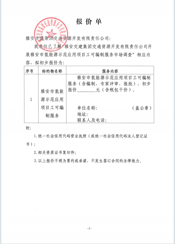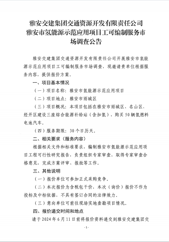 雅安交建集團(tuán)交通資源開發(fā)有限責(zé)任公司雅安市氫能源示范應(yīng)用項目工可編制服務(wù)市場調(diào)查公告