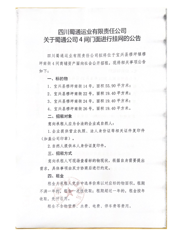 四川蜀通運業(yè)有限責任公司關于蜀通公司4間門面進行掛網的公告附件