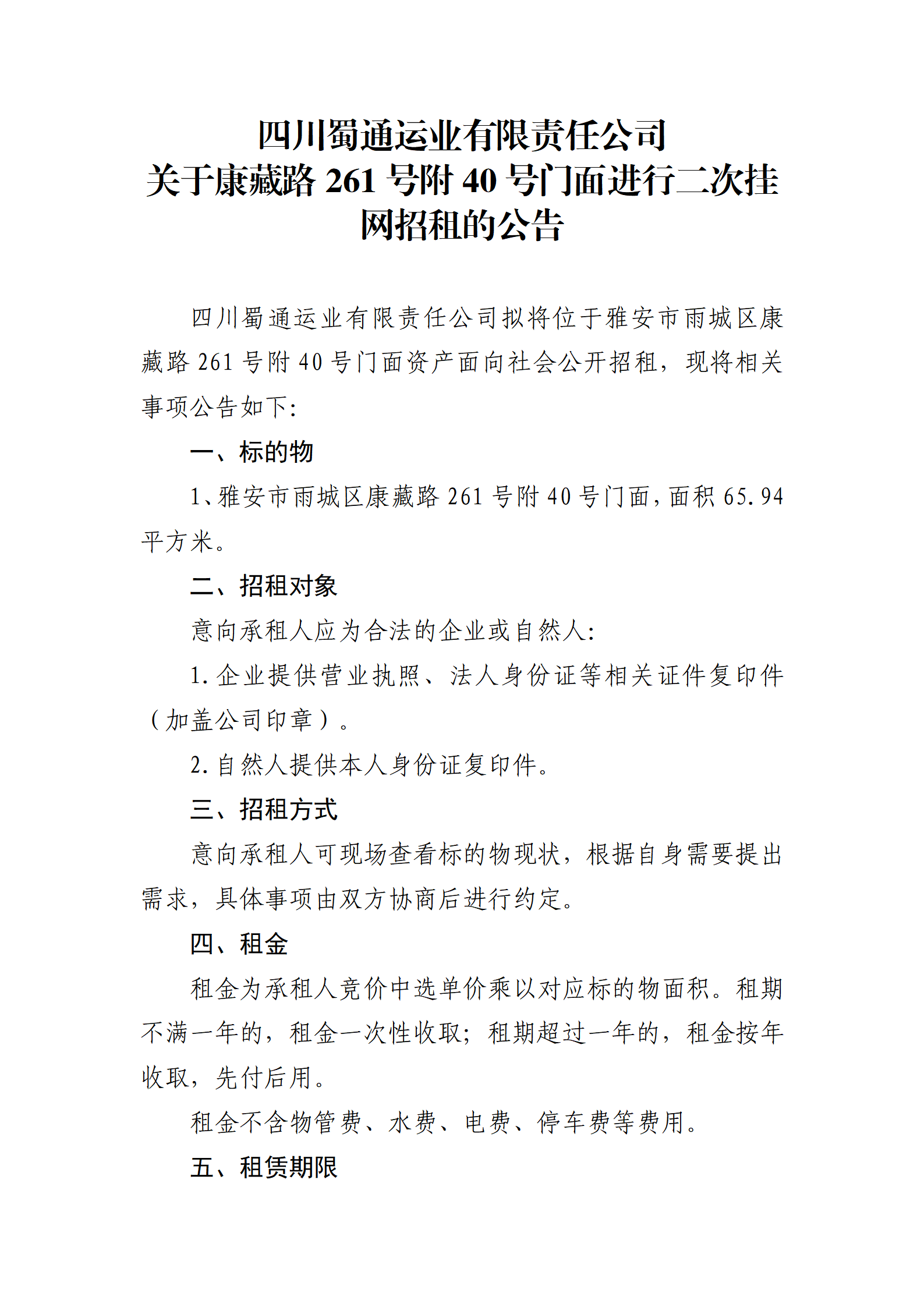 四川蜀通運業(yè)有限責(zé)任公司 關(guān)于康藏路261號附40號門面進行二次掛網(wǎng)招租的公告