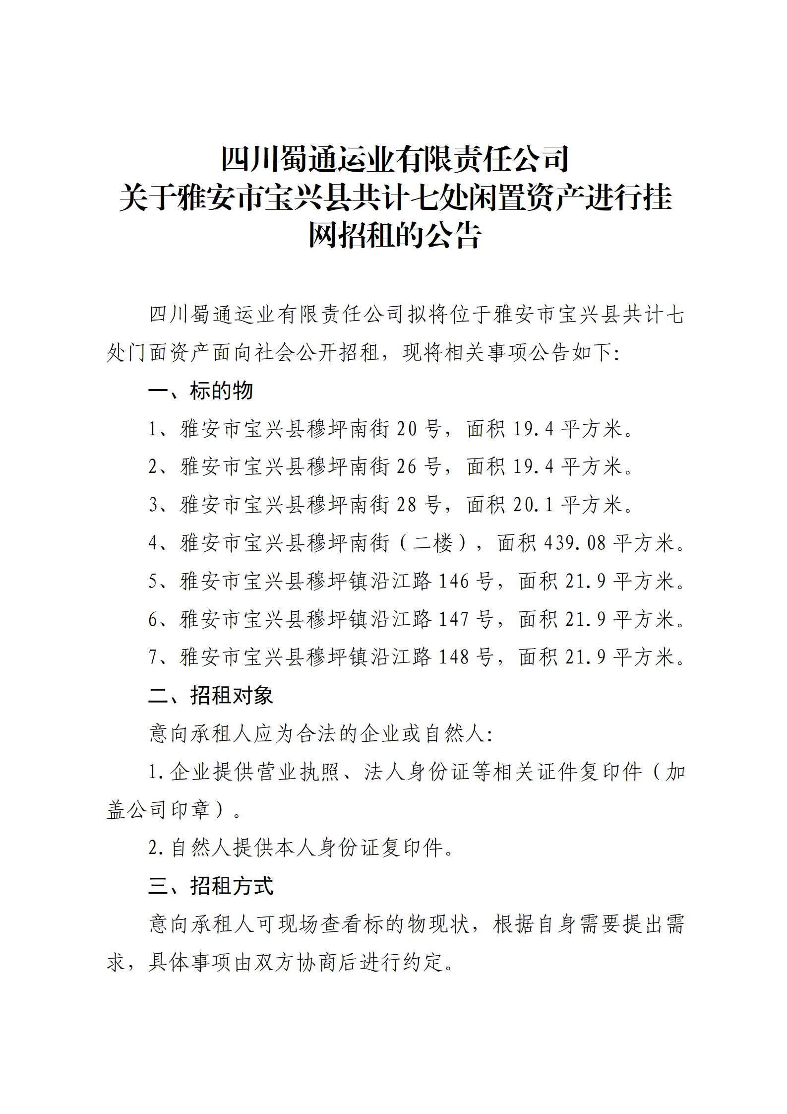 四川蜀通運業(yè)有限責任公司 關于雅安市寶興縣共計七處閑置資產進行掛網招租的公告